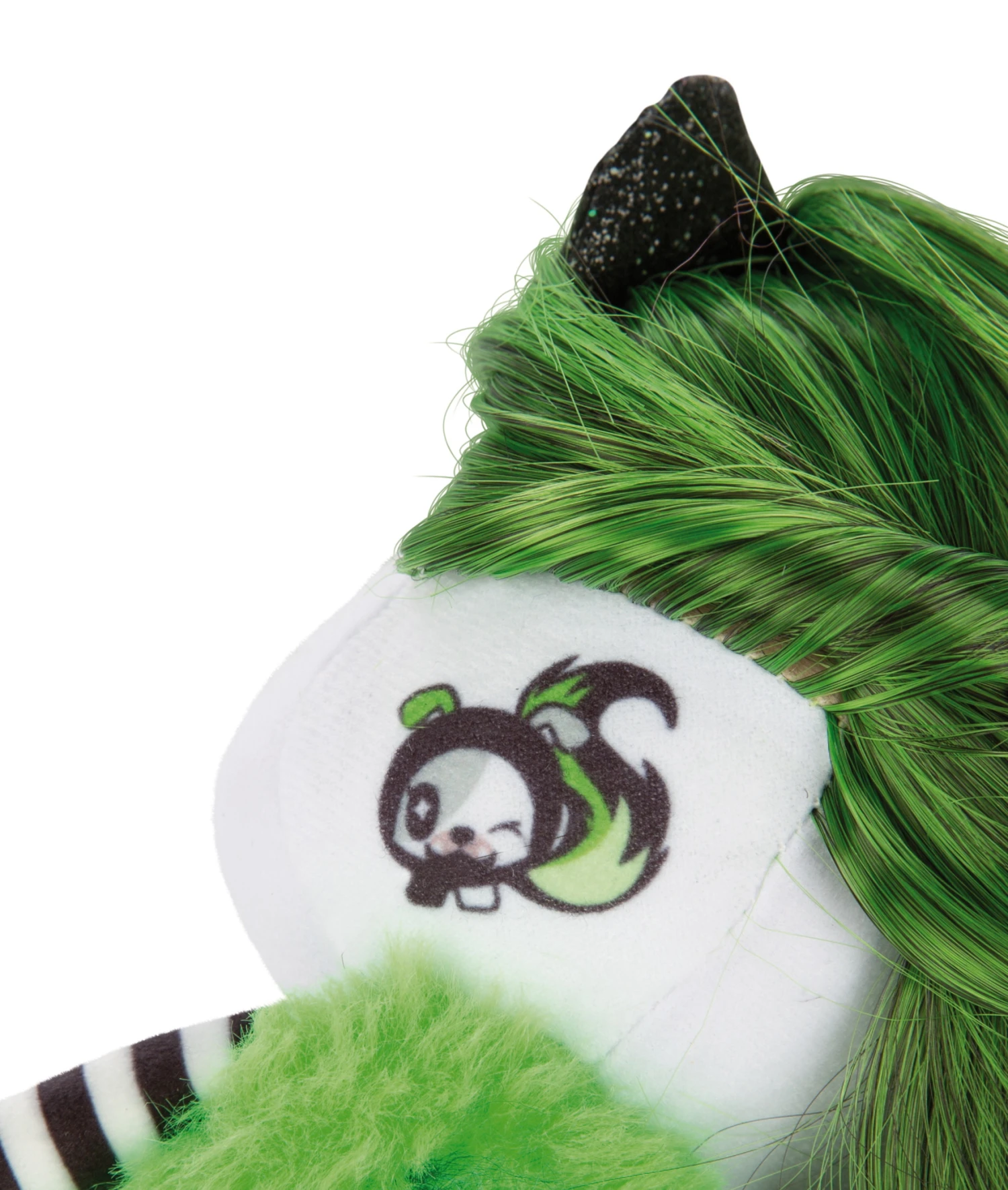 Zu der 20cm großen Puppe aus Plüsch mit den großen aufgestickten Augen, glitzernden Ohren und glitzernder Nase aus Kunststoff gibt es einen Kamm, passende Tattoos sowie ein Armbändchen.