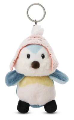 Das Vögelchen trägt eine weiche Plüschmütze mit Metallic All-Over-Druck